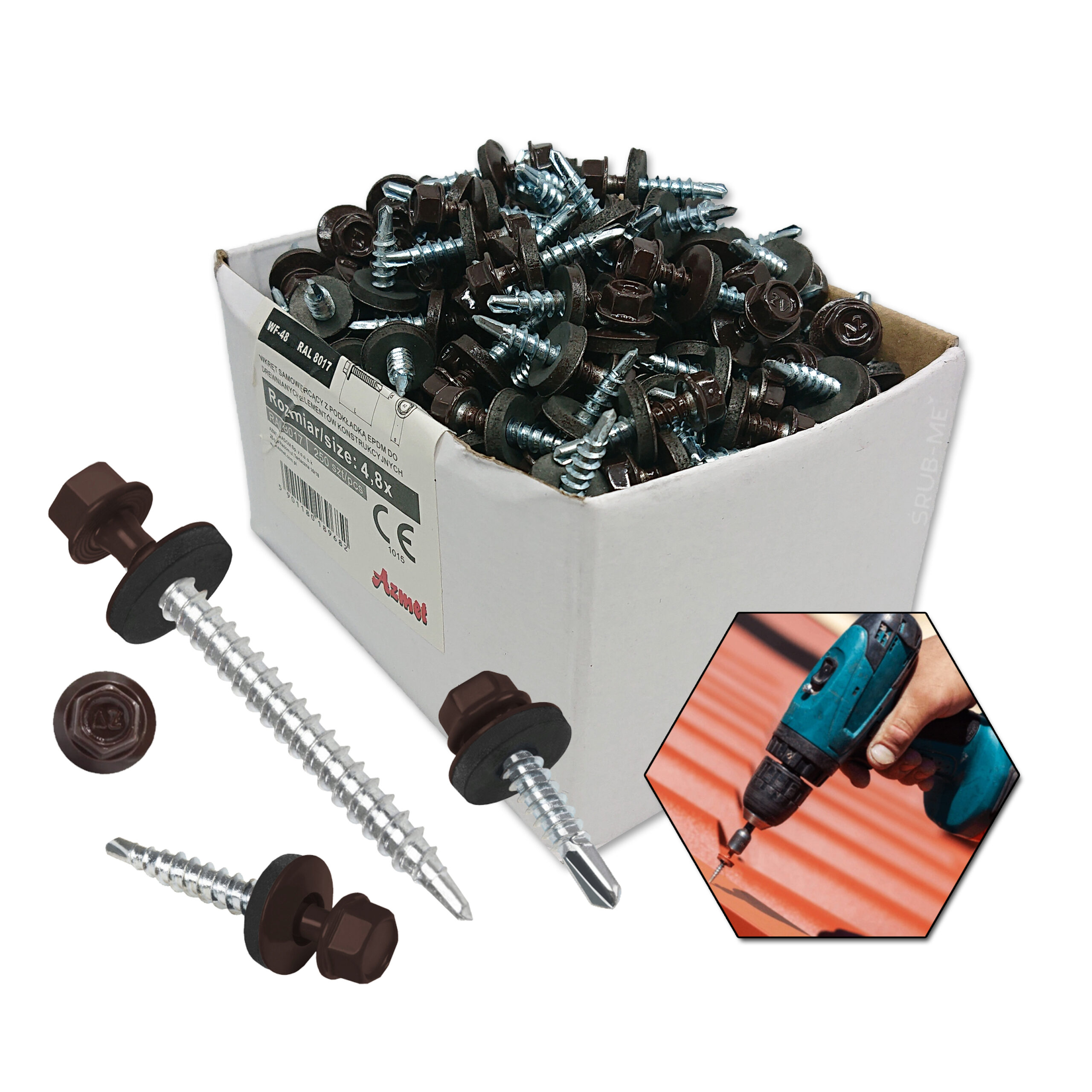 Wkręty farmerskie AZMET 4,8×25 mm RAL 8017 (brązowy) to wysokiej klasy elementy montażowe stworzone do mocowania blach dachowych i elewacyjnych. Dzięki powłoce ocynkowanej są odporne na korozję, a podkładka EPDM zapewnia doskonałą szczelność i ochronę przed przeciekami. Główka w kolorze brązowym doskonale komponuje się z pokryciem dachowym, nadając całości estetyczny wygląd.